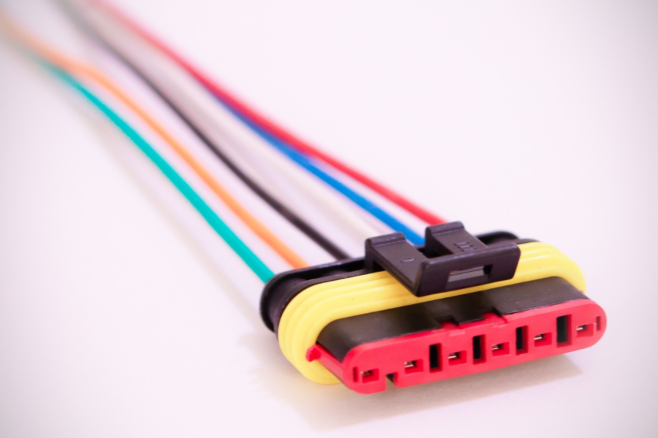 Conector 6 vias usado em sensores e atuadores. Fácil instalação e boa resistência mecânica.